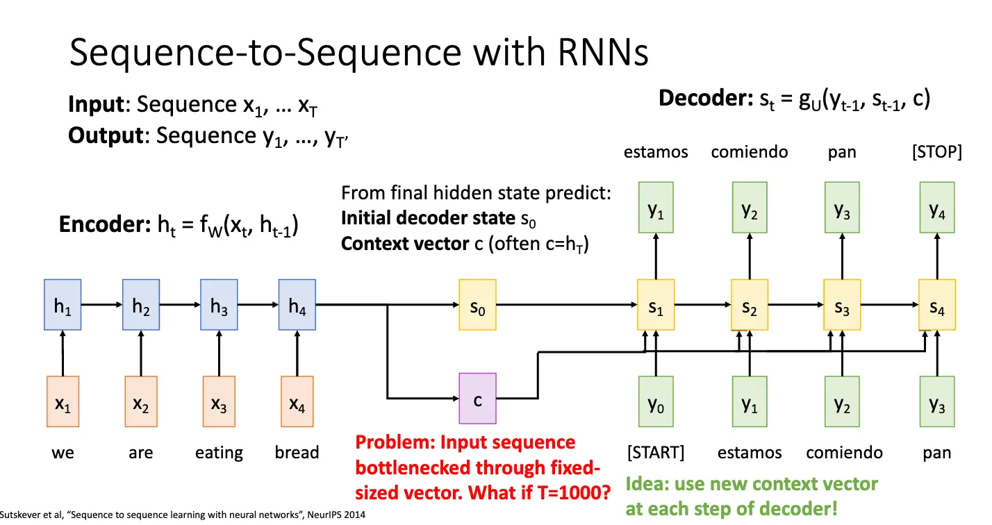 因此我们就需要引入注意力机制/Attention,基本架构还是差不多,还是 Encoder 和 Decoder 两个部分,但是我们对上下文向量进行了一些调整,基本想法是:将当前编码器的状态 \(h_i\) 和当前隐藏层状态 \(s_0\) 进行比较,计算出对齐分数 \(e_{t, i} = f_{\text{att}}(s_{t-1}, h_{i})\),对齐分数指出输入序列和当前解码器状态的相似度,然后使用 Softmax 函数进行归一化权重 \(\alpha_{t, i}\),将其转化为概率分布,最后将这些权重乘以编码器的状态 \(h_i\) 并求和得到当前输入解码器的上下文向量 \(c_t\)。