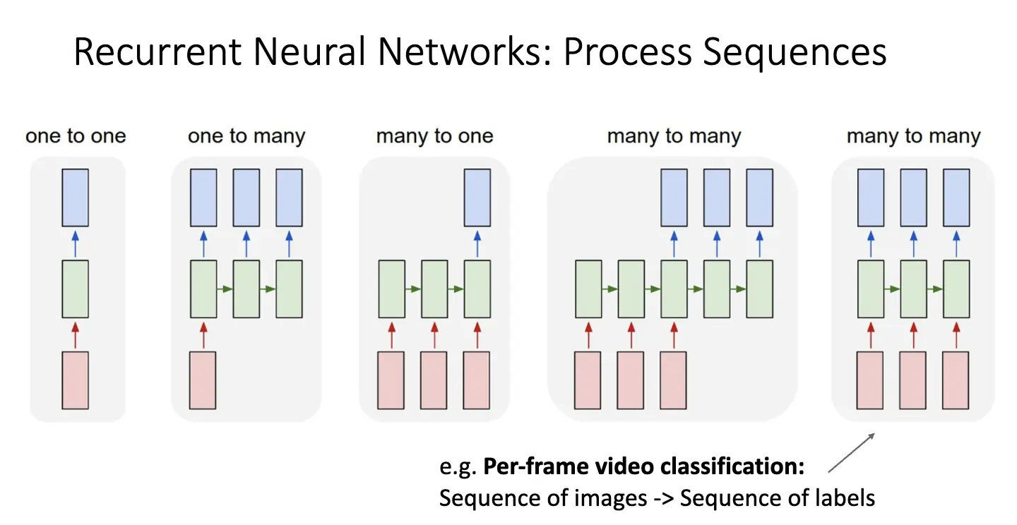 - 多对一:比如视频分类任务:Sequence of Images -> Label;