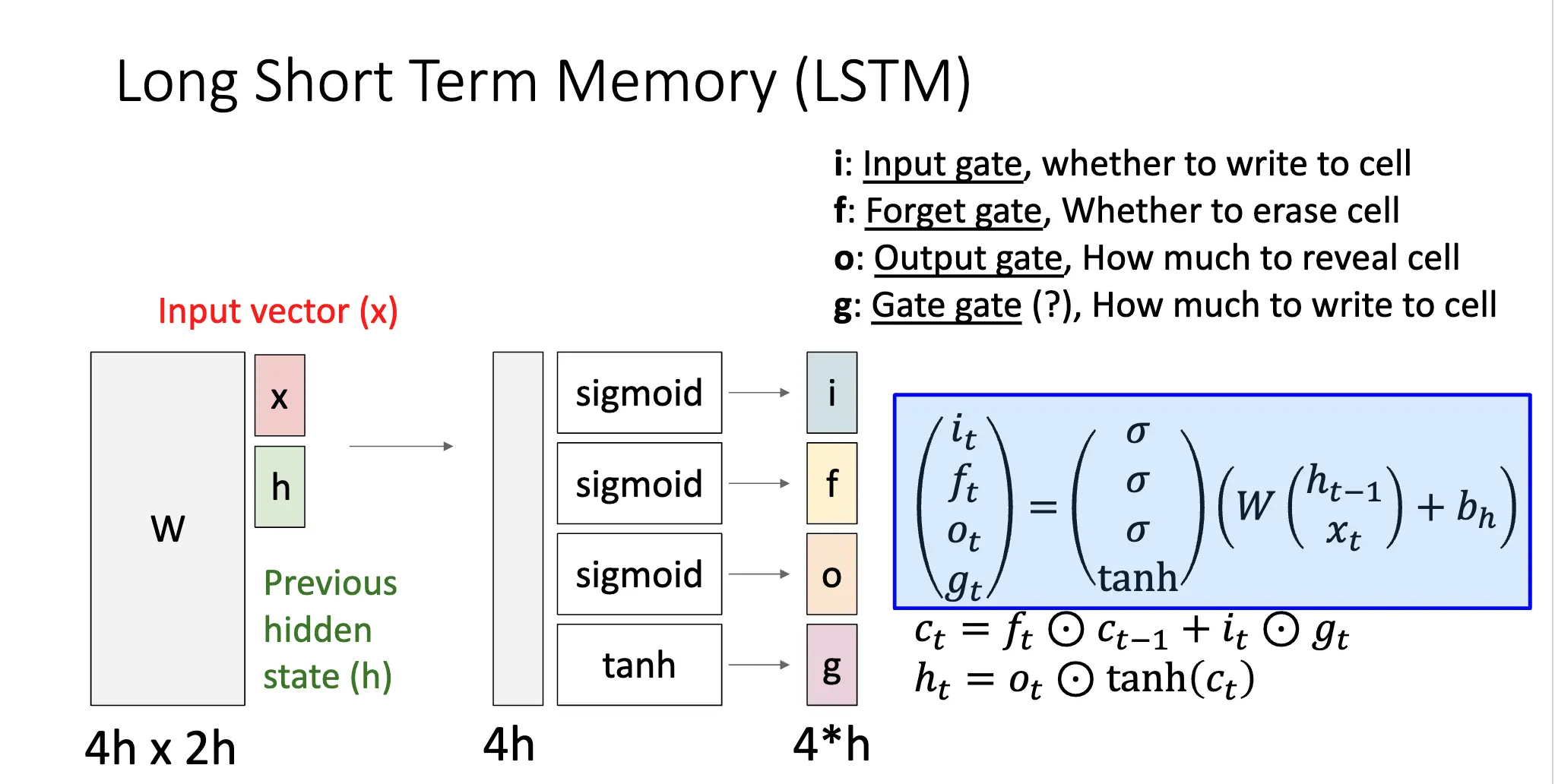 梯度消失/Gradient Vanishing:来自于 \(W_{hh}\) 的最大特征值小于 1,解决方法只能是修改 RNN 架构,比如下面的长短期记忆网络/Long Short-Term Memory/LSTM:
