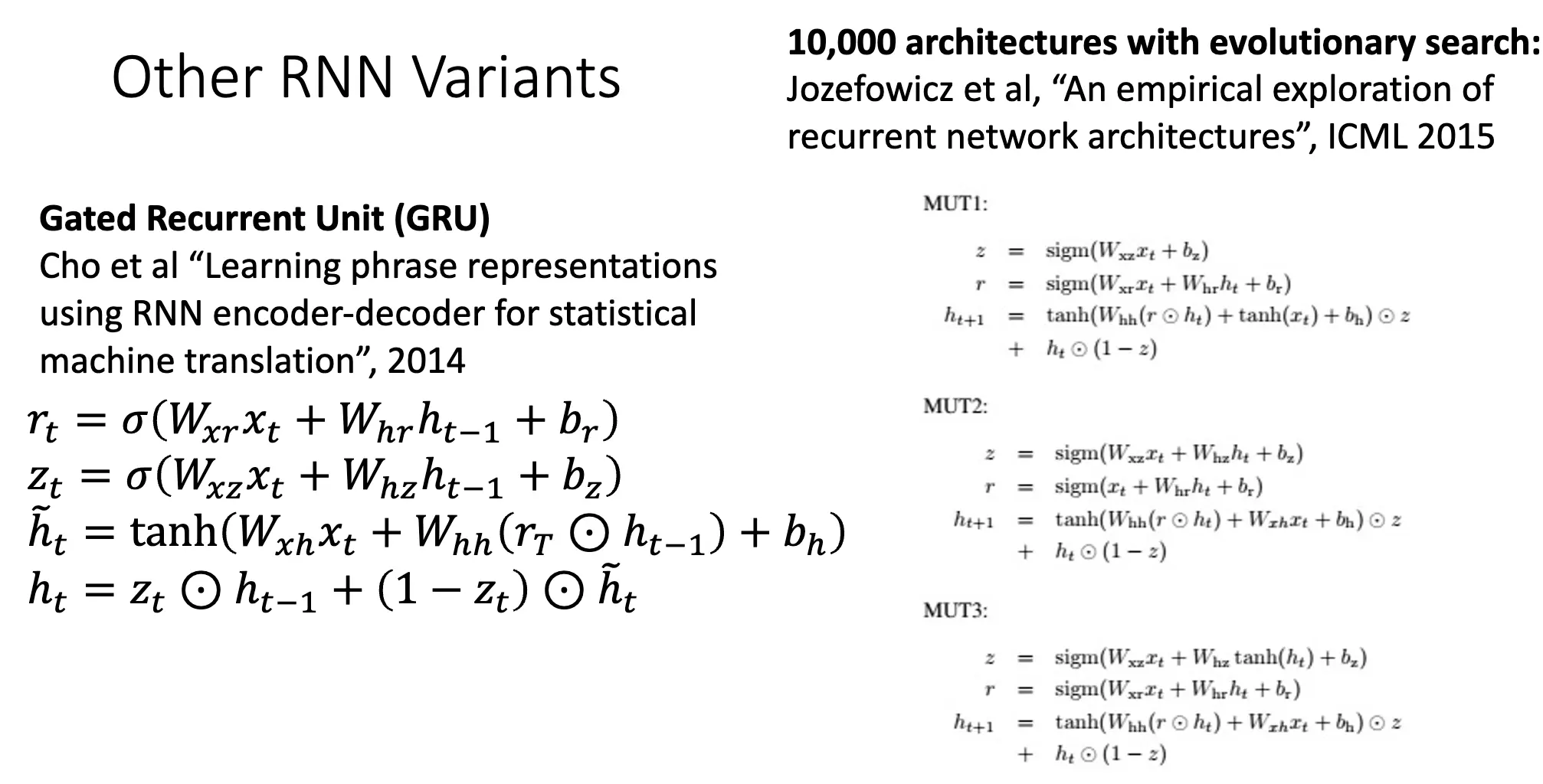 另一个变种是门控循环单元/Gated Recurrent Unit/GRU,结构更加简单,只有两个门:Reset Gate 和 Update Gate,并且将 Cell State 和 Hidden State 合并为单个状态。
