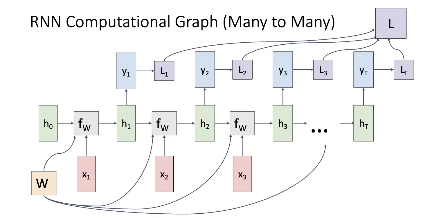 RNN 的计算图如下,对于 Many to Many 的情况,我们需要在每一个时刻根据当前状态和输入计算出下一个时刻的隐藏状态,并且根据隐藏状态计算出输出。这种情况的损失计算方法为:对每一时刻的输出计算损失再求和。
