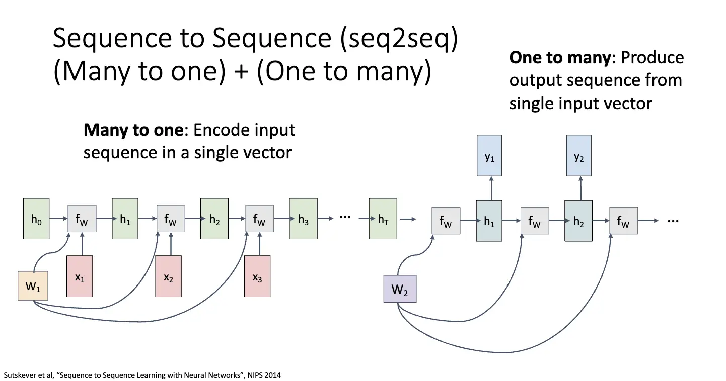 - 多对多:比如机器翻译任务,Sequence of Words -> Sequence of Words;
