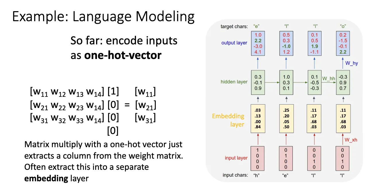 Language Modeling 是一个经典的问题,具体细节暂且不表,需要注意的是输入的处理:一个经典的想法是将输入编码为独热码,但是这会使得输入矩阵过于稀疏,并且难以处理长序列。因此我们使用词嵌入/Word Embedding 来将输入编码为密集向量。