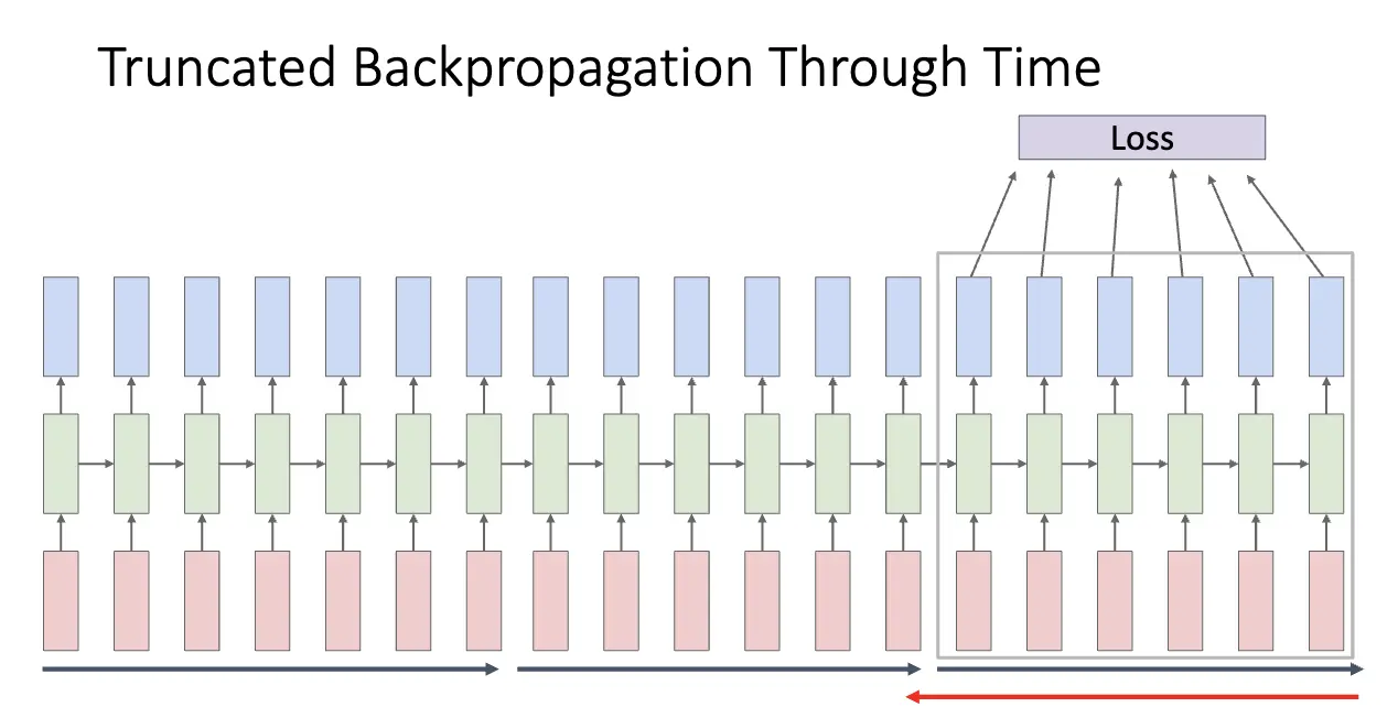 RNN 的反向传播也是一个问题,问题来自于其结构:对于循环公式而言,我们需要将梯度从当前状态传播到前一个状态,也就是沿着时间展开 Back Propagation Through Time/BPTT。注意到如果我们在自然语言处理领域处理长序列,我们可以很容易达到非常长的序列,比如你正在看的这篇笔记到这里已经有了两万余字符,这样展开的 RNN 就会非常深,因此需要考虑一下如何处理。大概想法是 Truncated BPTT,也就是只展开一小段时间,然后进行反向传播。