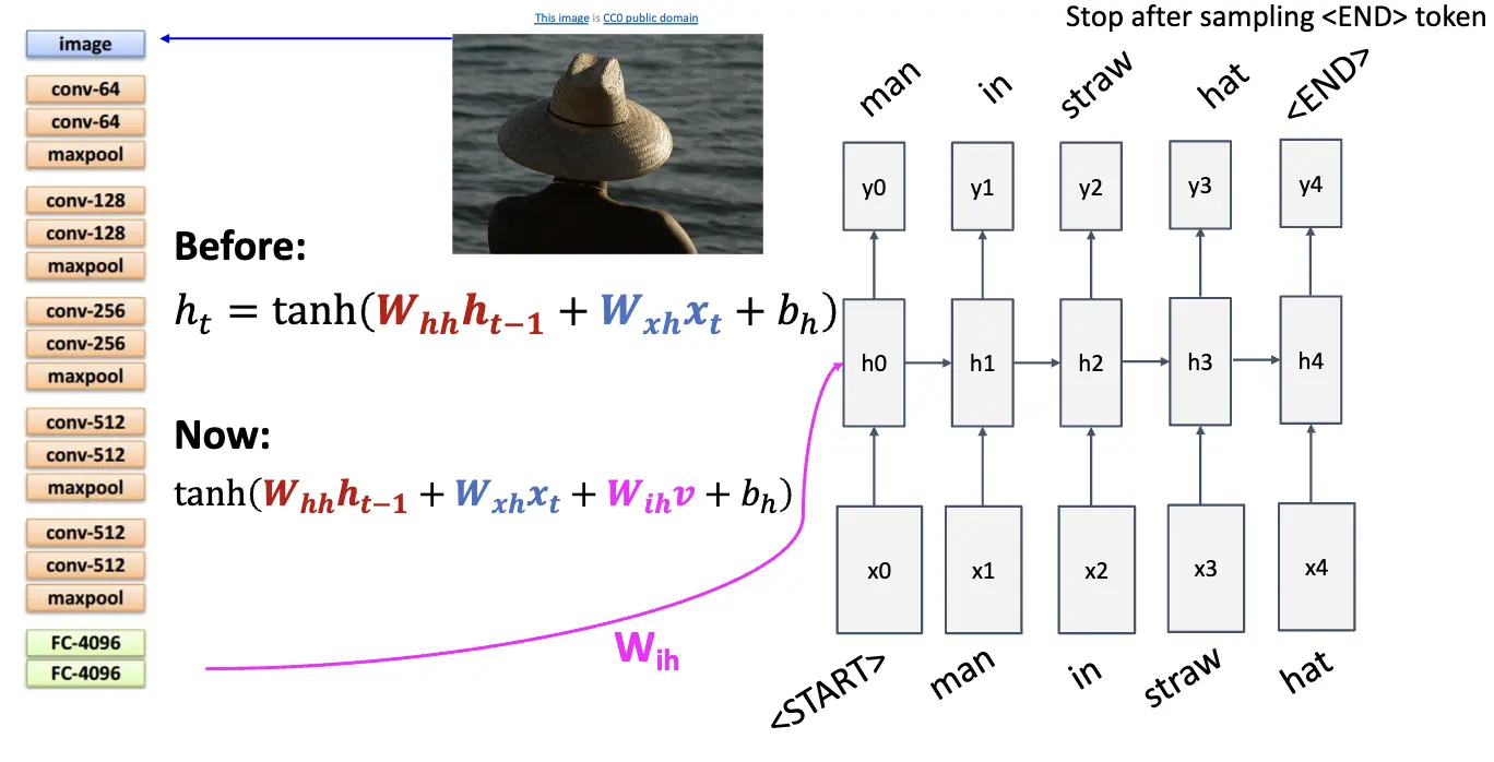 下图是一个 Image Captioning 的例子,输入是一张图片,骨干网络输出一个特征图,将特征图喂给 RNN 生成描述。