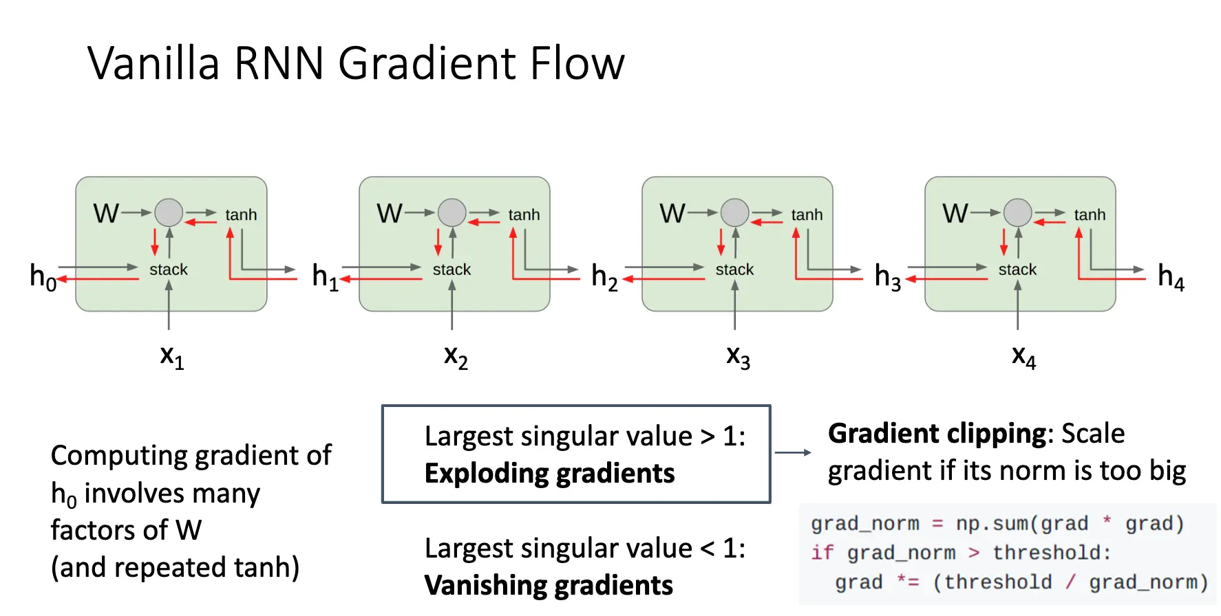 可以看到,当我们对 \(h\) 进行反向传播的时候,每一步都会乘以一个 \(W_{hh}\),当层数一多,就会出现两种问题: