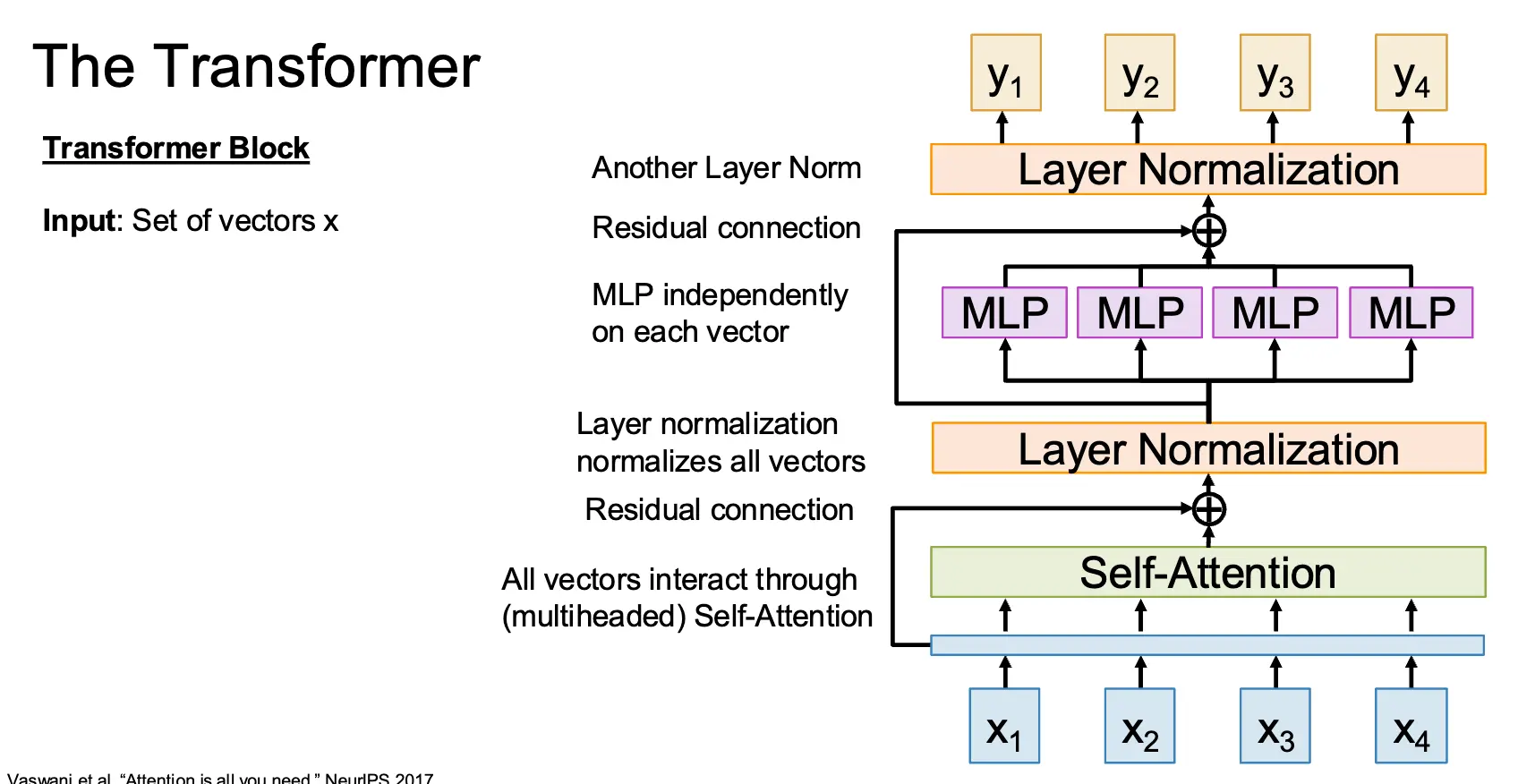 我们可以基于 Self-Attention 构建出 Transformer 块:假设输入为 \(x_1, x_2, \cdots, x_N\),首先将输入通过自注意力层,注意自注意力层是整个架构内唯一有向量之间交互的层,然后通过残差连接和层归一化,接着通过多层感知机,最后通过残差连接和层归一化输出为另一个输出向量集合 \(y_1, y_2, \cdots, y_N\)。