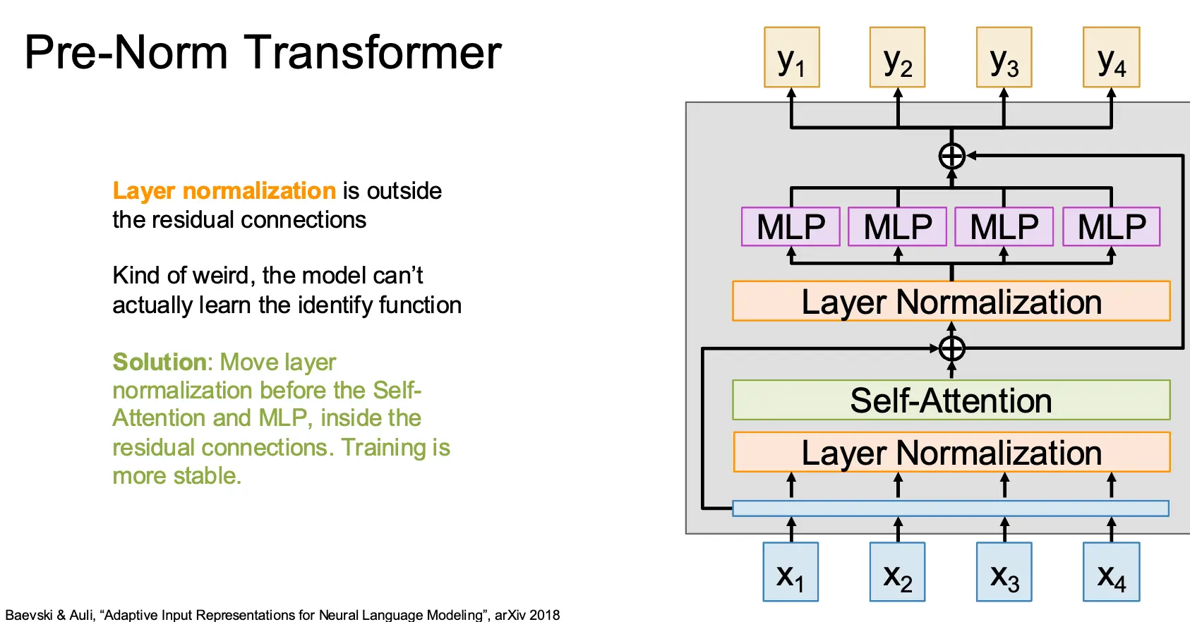 现代的 Transformer 对原来的 Transformer 进行了一些修改,比如将 Layer Normalization 直接放在残差链接外实际上不太好,这样的模型甚至不能学到 Identity Function,因此需要将归一化层放在残差链接内部。