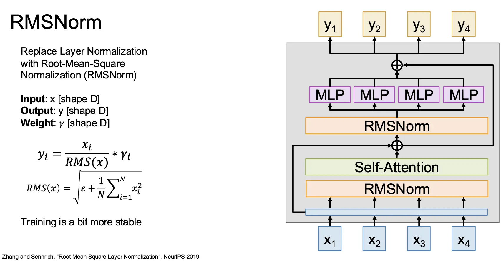 对于归一化来讲,我们还可以使用 RMSNorm/Root-Mean-Square Layer Normalization 来替代 Layer Normalization,其输入为 \(x\),输出为 \(y\),权重为 \(\gamma\),计算为 \(y_i = \frac{x_i}{RMS(x)} * \gamma_i\),其中 \(RMS(x) = \sqrt{\epsilon + \frac{1}{N}\sum_{i=1}^N x_i^2}\)。这使得训练更加稳定一点。