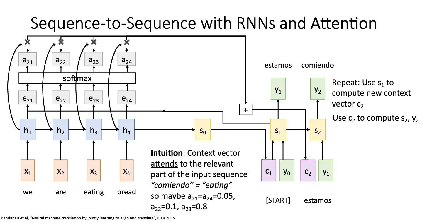 因此我们就需要引入注意力机制/Attention,基本架构还是差不多,还是 Encoder 和 Decoder 两个部分,但是我们对上下文向量进行了一些调整,基本想法是:将当前编码器的状态 \(h_i\) 和当前隐藏层状态 \(s_0\) 进行比较,计算出对齐分数 \(e_{t, i} = f_{\text{att}}(s_{t-1}, h_{i})\),对齐分数指出输入序列和当前解码器状态的相似度,然后使用 Softmax 函数进行归一化权重 \(\alpha_{t, i}\),将其转化为概率分布,最后将这些权重乘以编码器的状态 \(h_i\) 并求和得到当前输入解码器的上下文向量 \(c_t\)。
