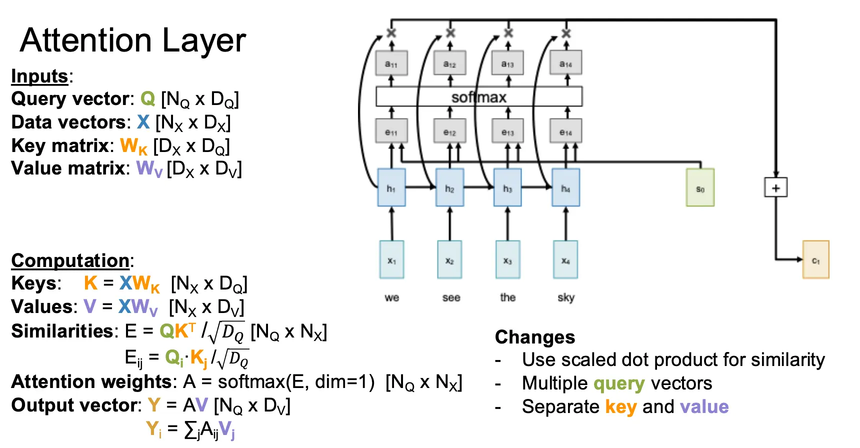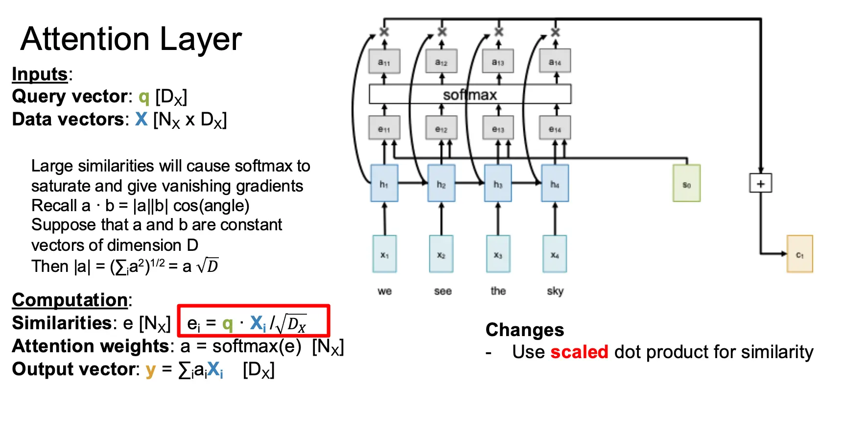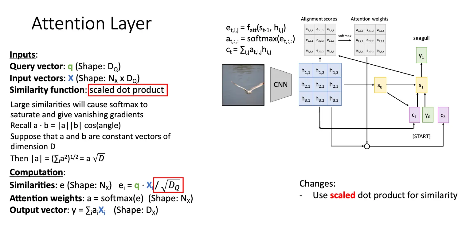 最简单的注意力层的输入是一个查询向量 \(q\)、一个输入序列 \(X\) 和一个相似度函数 \(f_{\text{att}}\)。经过计算得到一个相似度向量 \(e\) 与一个注意力权重 \(a\),表示查询向量与输入向量序列中每个元素的相似度与重要性,并且产出一个输出向量 \(y\)。需要注意的是,当前相似度函数是点积,点积作为相似度函数已经足够好用了,但是点积和 Softmax 会有奇怪的相互作用,当向量的长度增大的时候,点积的值会增大,而 Softmax 会将这个值压缩,导致梯度消失。因此我们使用缩放点积作为相似度函数,也就是 \(e_i = \dfrac{q \cdot X_i}{\sqrt{D_Q}}\),其中 \(D_Q\) 是查询向量的维度。