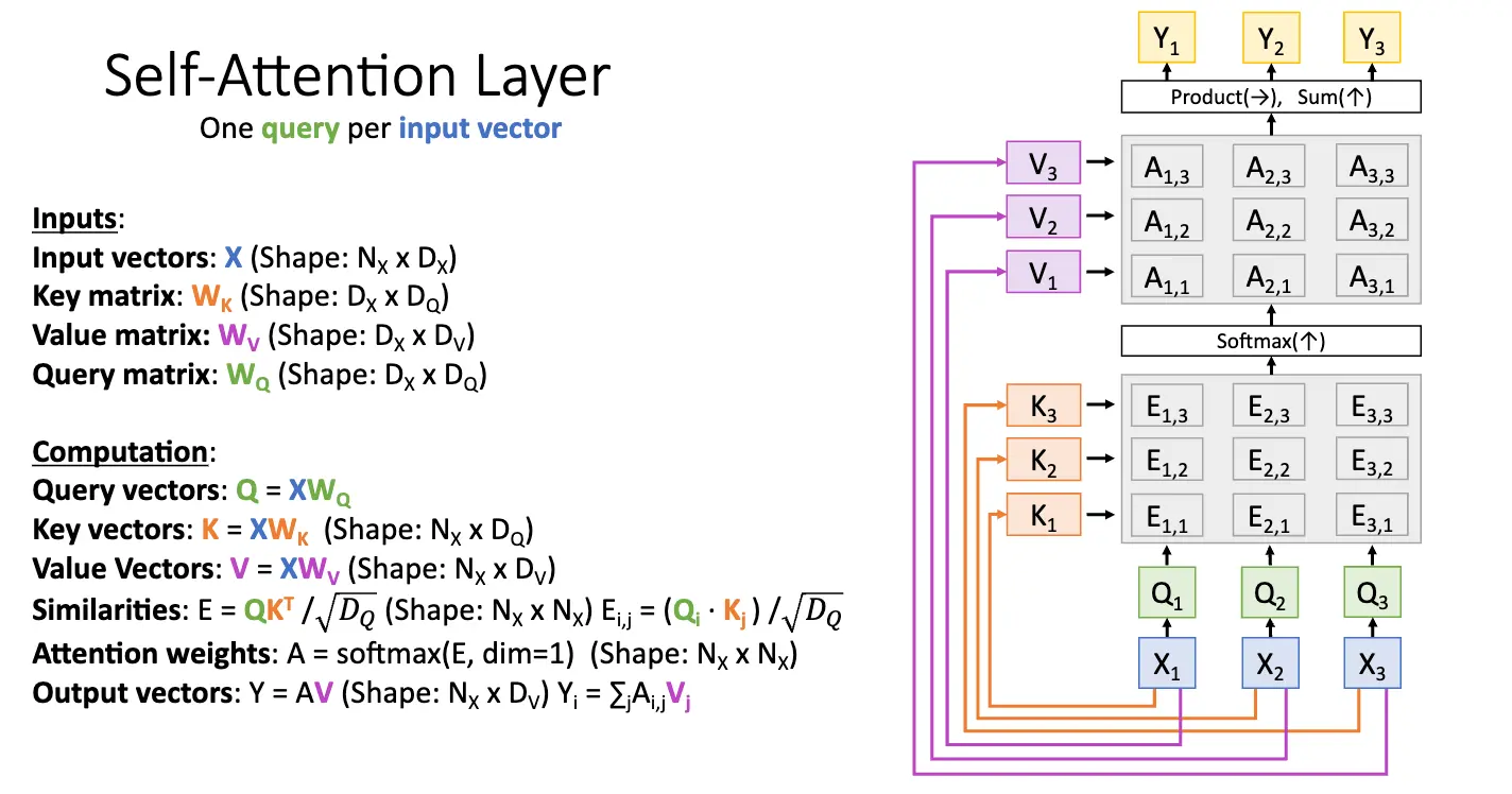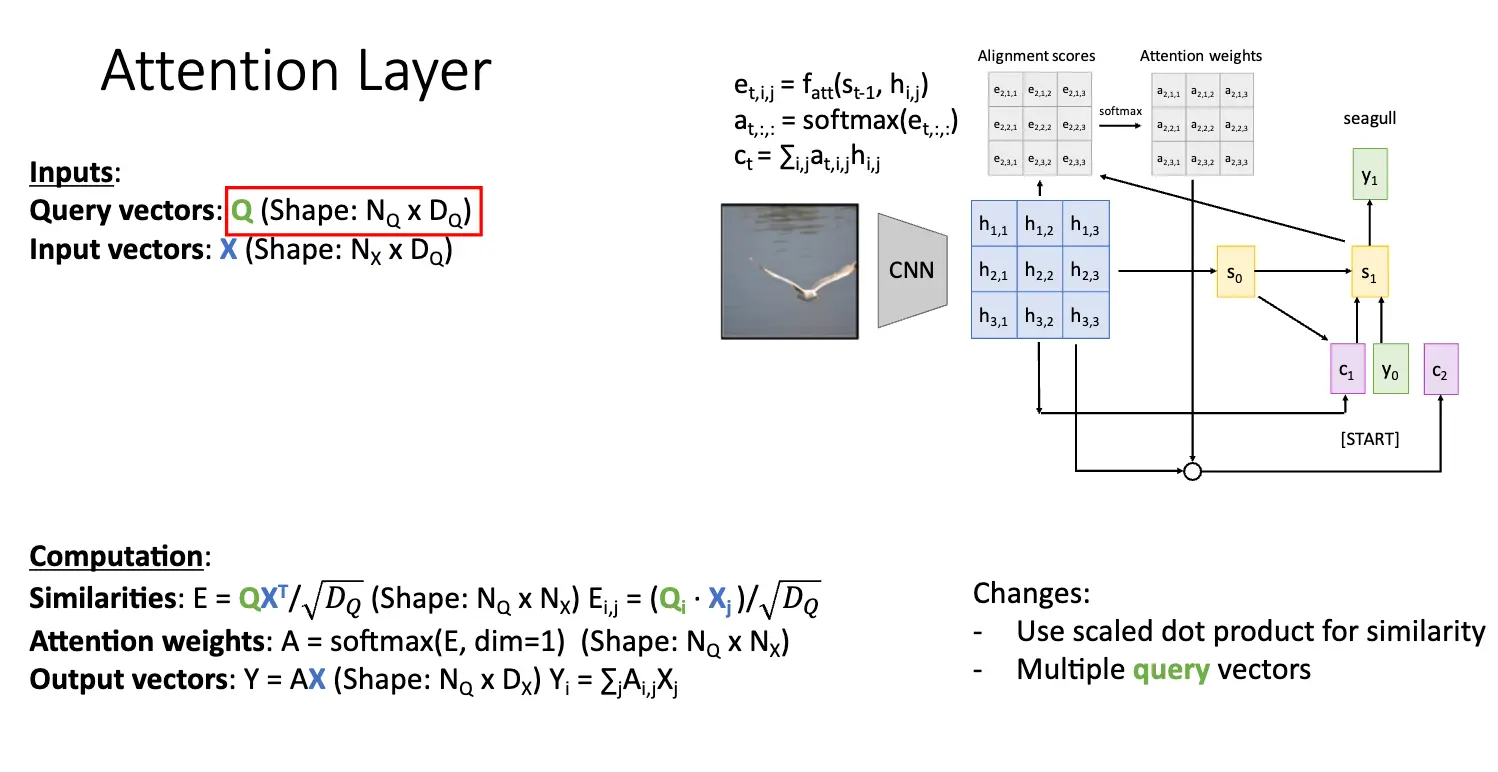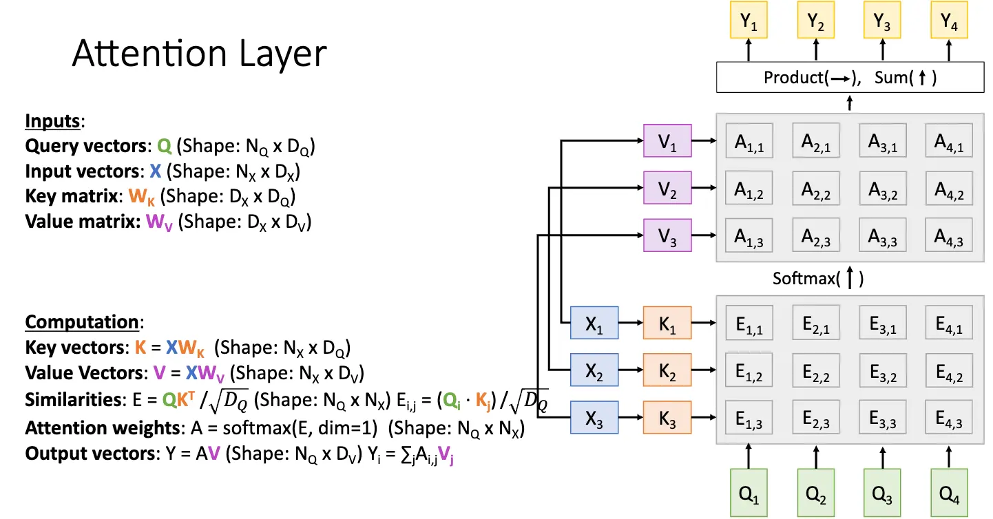 对于多个查询向量 \(Q\),比如有 \(N_Q\) 个,那么我们就可以计算出每一个查询向量 \(Q_i\) 和每一个输入向量的相似度 \(E_{i, j} = (Q_i \cdot X_j) / \sqrt{D_Q}\),然后使用 Softmax 函数对相似度矩阵的每一个相似度向量进行归一化,最后计算出输出向量序列。这部分就很直观了。