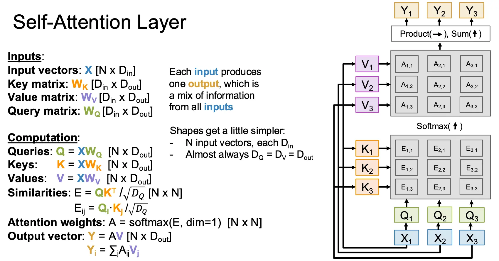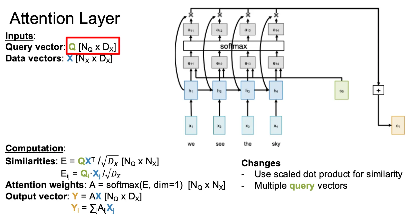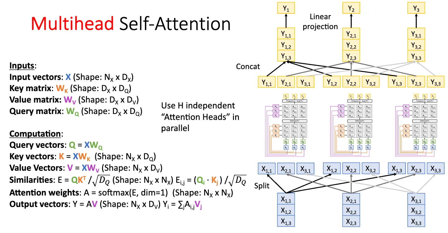 对于多个查询向量 \(Q\),比如有 \(N_Q\) 个,那么我们就可以计算出每一个查询向量 \(Q_i\) 和每一个输入向量的相似度 \(E_{i, j} = (Q_i \cdot X_j) / \sqrt{D_Q}\),然后使用 Softmax 函数对相似度矩阵的每一个相似度向量进行归一化,最后计算出输出向量序列。这部分就很直观了。