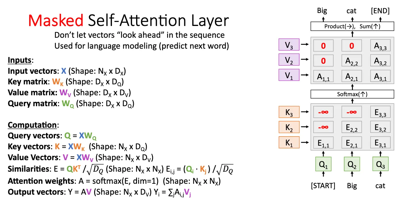 有时候我们不希望模型关注到当前时间步之后的位置,也就是不希望提前看到未来的信息,这样有时候相当于作弊,这时候我们可以使用掩码/Mask 来限制模型只能看到当前时间步之前的信息,这样严格限制模型只能使用过去的信息,称为因果掩码/Causal Masking。