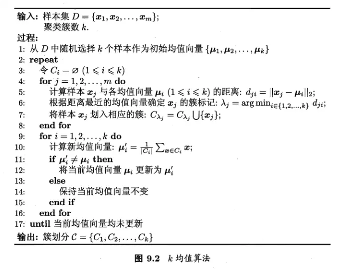 我们令需要求解的原型向量为均值向量,首先对均值向量进行初始化,然后在迭代过程中交替进行两个步骤:保持当前均值向量不变,计算每个样本与所有均值向量的距离,将其划入距离最近的簇;保持当前簇划分不变,更新每个簇的均值向量。重复上述过程直至收敛,即可得到最终的簇划分。对上述过程的重复可能设置对应阈值,例如最大迭代次数。