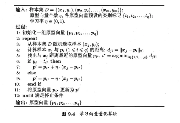 LVQ 的聚类生成过程受监督信息的辅助:随机选择样本,找出与其最近的原型向量,根据两者的类别标记是否一致来对原型向量进行相应的更新。具体算法描述如下: