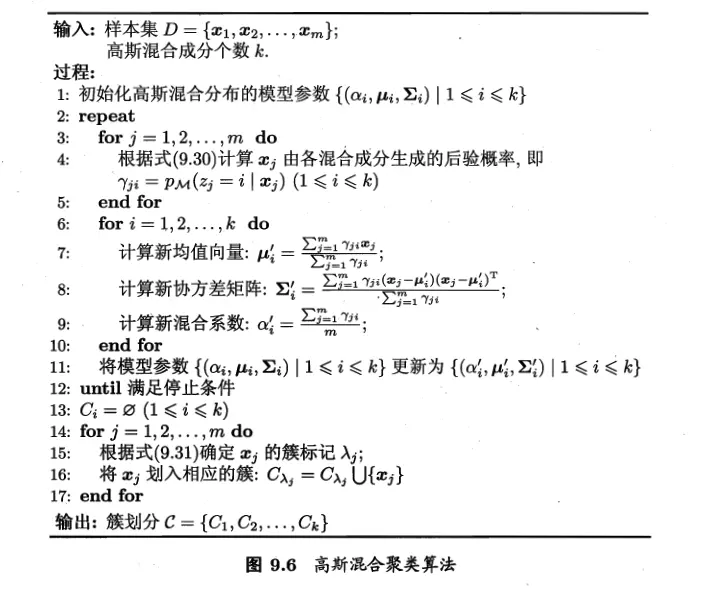 在每步迭代中,先根据当前参数来计算每个样本属于各个高斯成分的后验概率 \(\gamma_{ji}\)(E步);再根据后验概率和当前参数更新模型参数 \(\{(\alpha_i,\boldsymbol{\mu}_i,\boldsymbol{\Sigma}_i)\}_{i=1}^k\)(M步)。算法过程如下图所示: