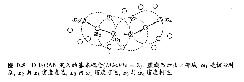 因为密度直达要求 \(\boldsymbol{x}_i\) 是一个核心对象,但是 \(\boldsymbol{x}_j\) 不一定是核心对象,所以密度直达一般不满足对称性,密度可达关系满足传递性但不满足对称性,密度相连关系满足对称性和传递性。