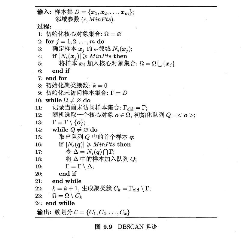 如何从数据集 \(D\) 中找出满足以上性质的聚类簇呢?实际上,若 \(\boldsymbol{x}\) 为核心对象,由 \(\boldsymbol{x}\) 密度可达的所有样本组成的集合记为 \(X = \{\boldsymbol{x}' \in D \mid \boldsymbol{x}' \text{ is density-connected by }\boldsymbol{x}\}\) 则很容易见得 \(X\) 即为包含 \(\boldsymbol{x}\) 的最大的密度相连样本集合。