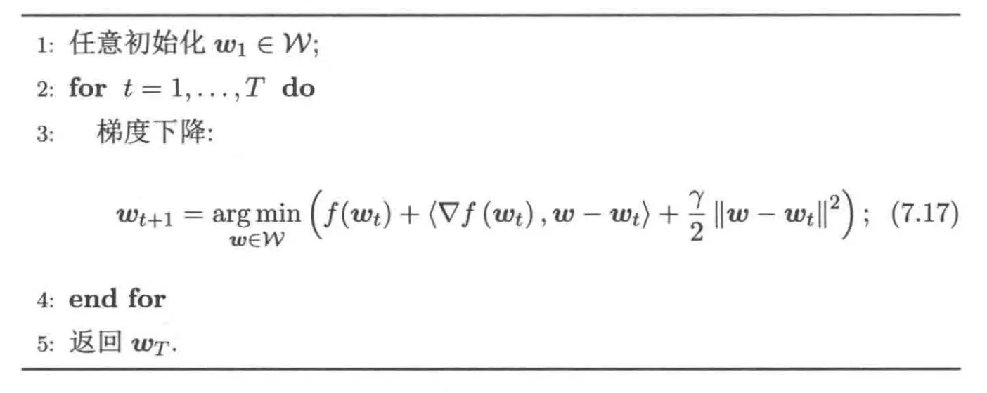 定理 7.1(梯度下降收敛率):假设目标函数 \(f(\cdot)\) 是凸的 \(l\)-Lipschitz 连续函数,且可行域 \(\mathcal{W}\) 有界,则采用固定步长梯度下降的收敛率为 \(O\left(1/\sqrt{T}\right)\)。