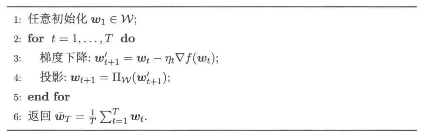 对于一般的凸优化问题,可以采用梯度下降达到 \(O(1/\sqrt{T})\) 的收敛率,我们这里考虑的是梯度投影法,基本流程如下: