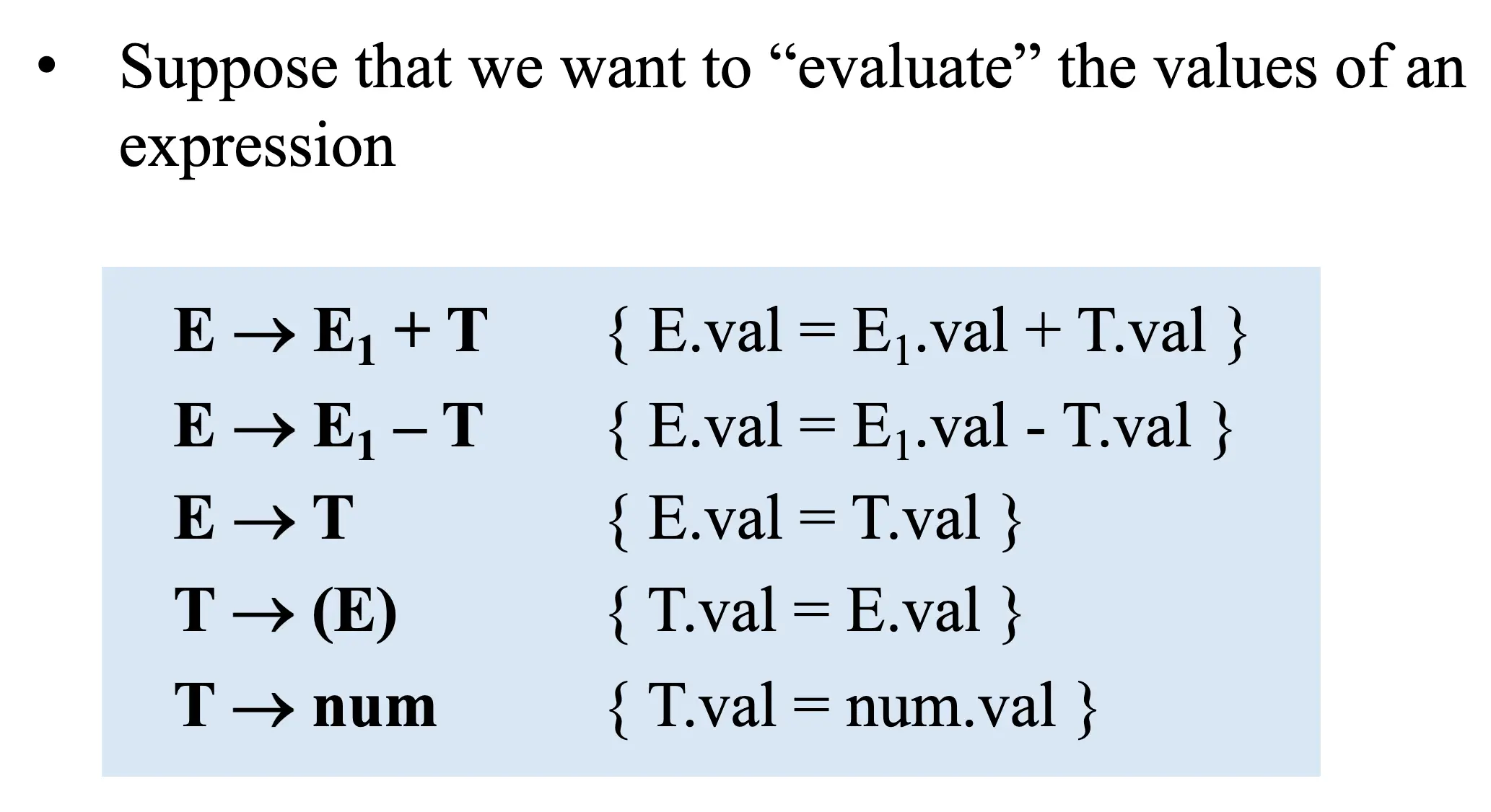 - 属性计算规则/语义规则:和产生式相关联,反映文法符号属性间关系的规则,比如如何计算非终结符 \(E\) 的属性 \(\mathrm{val}\)。