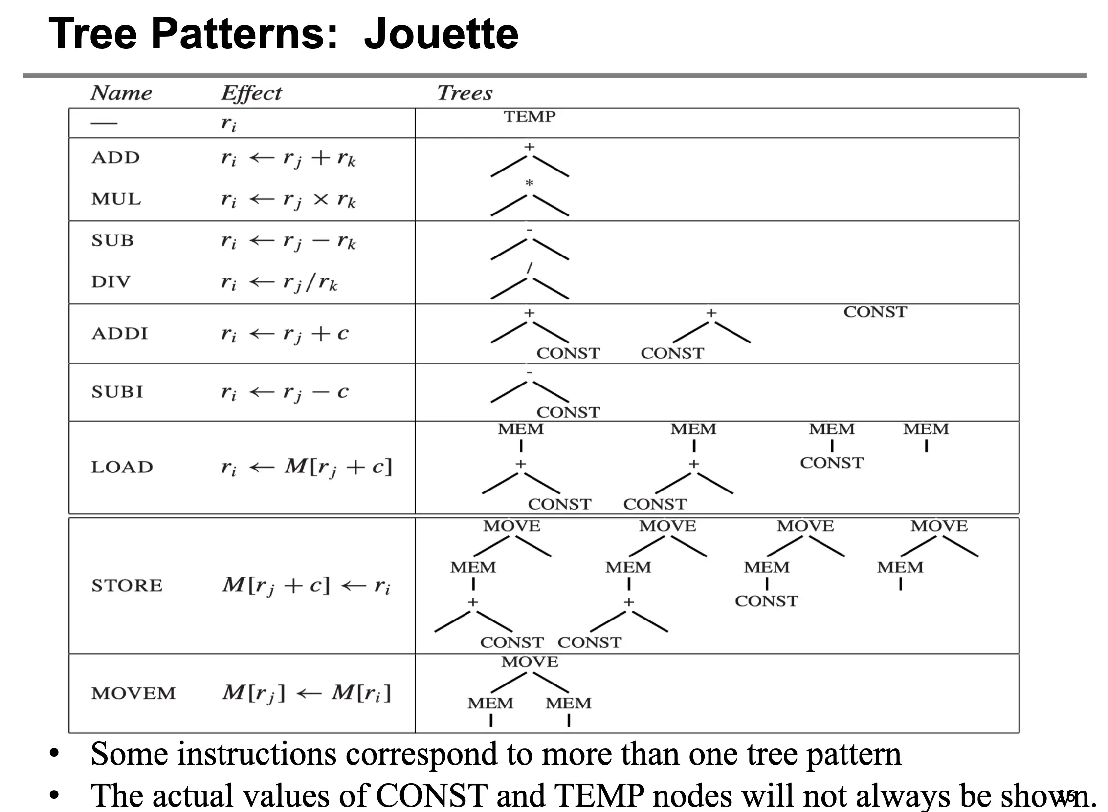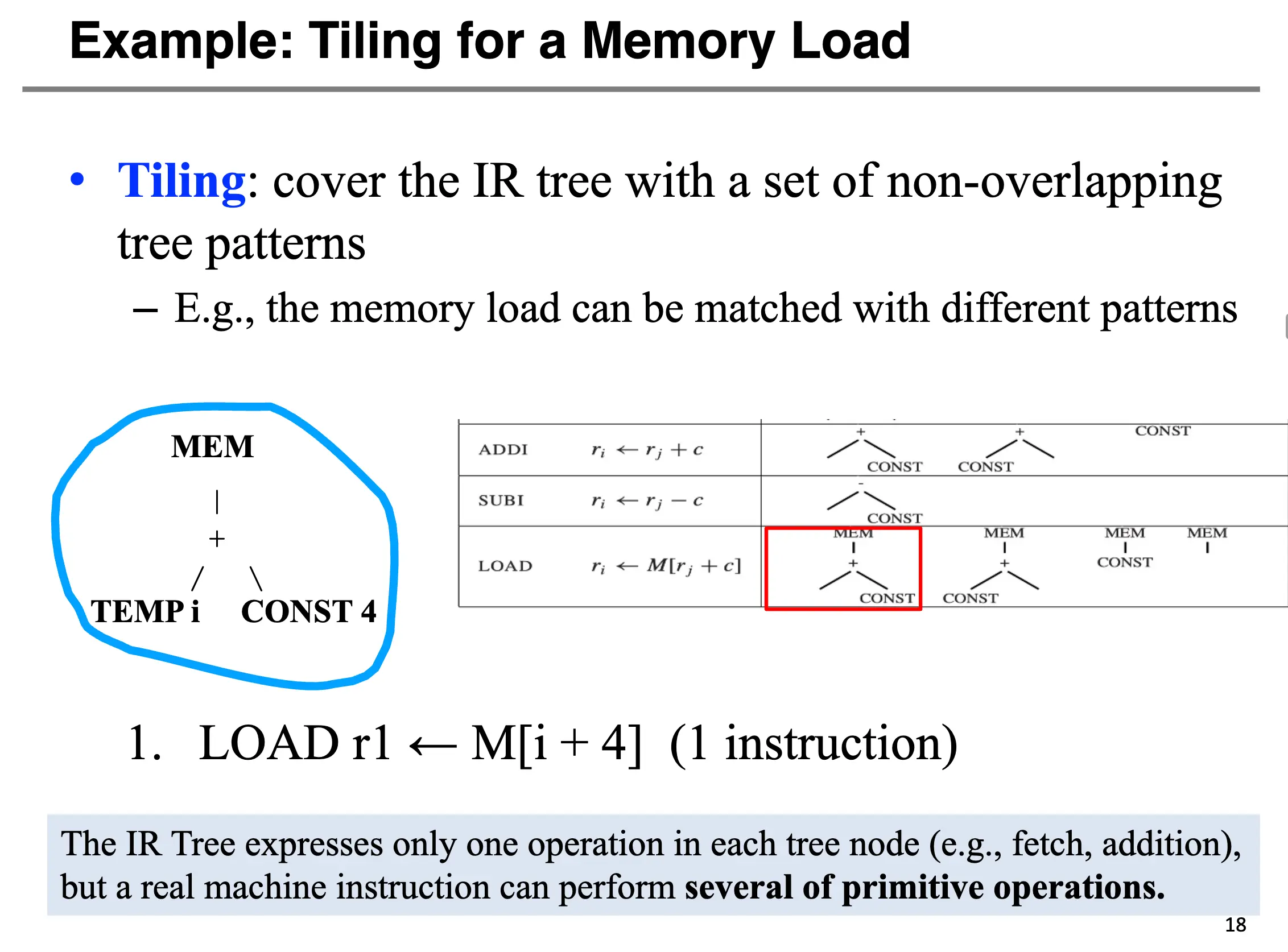 树类型/Tree Pattern 指的是可以匹配一个 IR Tree 的一部分的模板,每一个树类型都对应着一个机器指令。一个树类型也叫做一个 Tile。指令选择的目标是使用一个不互相覆盖的树类型集合覆盖掉 IR Tree,这样就可以将 IR Tree 转换为汇编代码序列了。可以把 Tiling 想象成铺地板的过程,每一个 Tree Pattern 就是各种大小不一的地砖,指令选择就类似于使用地砖铺满屋子。理论来讲,只要我们的 Tree Pattern 足够小且丰富,比如可以覆盖掉单一节点,我们就很有机会将程序对应的 IR Tree 完全覆盖掉。