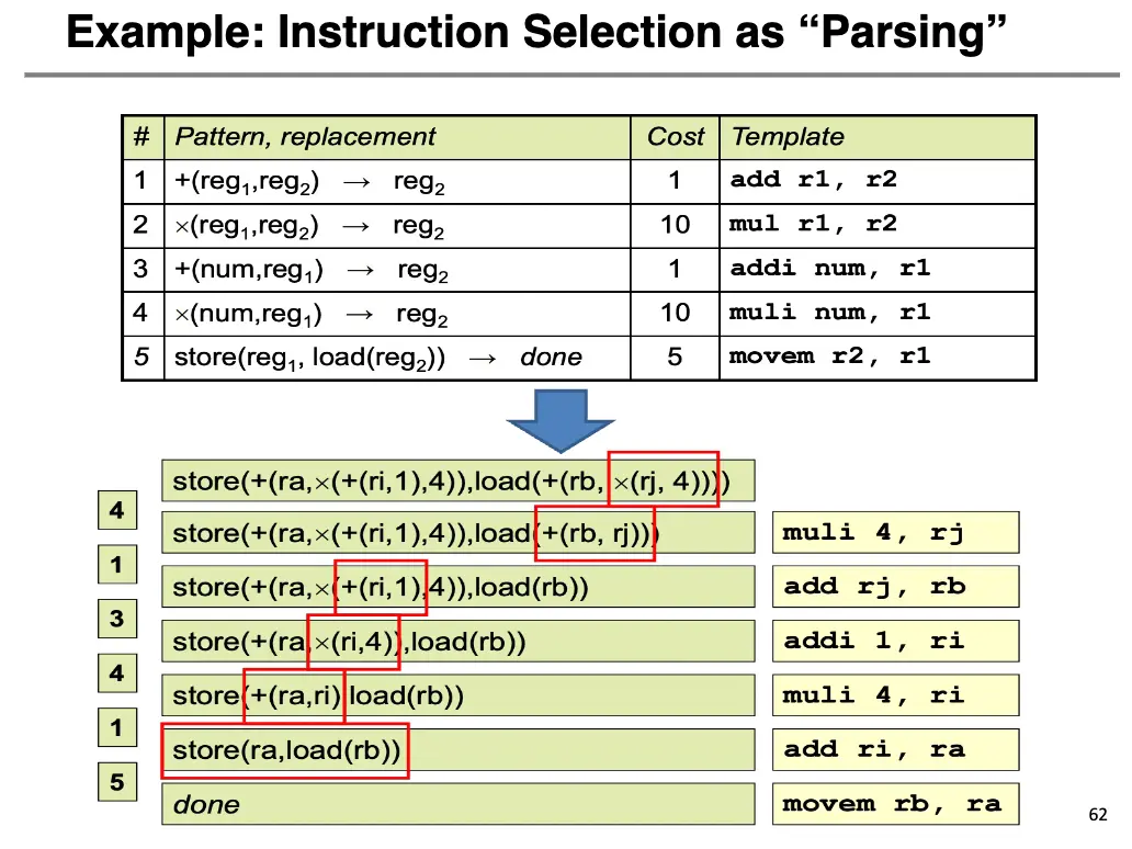 指令选择需要量度来评价选择的结果有多少,理想情况下需要考虑指令代价、运算对象和结果如何存储等等因素。比如从硬盘到主存再到寄存器,速度越来越快,但是容量越来越小,这就需要一定的权衡。我们可以选择比较小的 tiles,确保我们可以覆盖掉每一个 IR Tree,但是这样可能需要更多的 tiles/instructions,然而大量的指令并不一定意味着时钟周期数目庞大,比如 RISC-V 的绝大部分指令都只需要一个时钟周期,CISC 的某些指令需要十个或者更多的时钟周期。