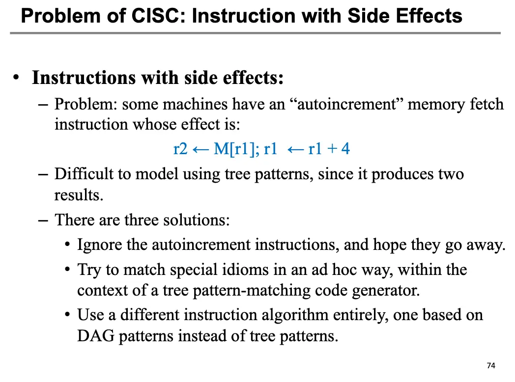 对于 RISC 来讲,全局最优和局部最优的覆盖一般没啥区别,因为 RISC 指令一般代价相近,都很小,但是对于 CISC 来讲,全局最优和局部最优差别就很大了,因为有的复杂指令可能组合了多个操作。因此,对于 RISC 来讲,简单的覆盖算法就已经足够了。