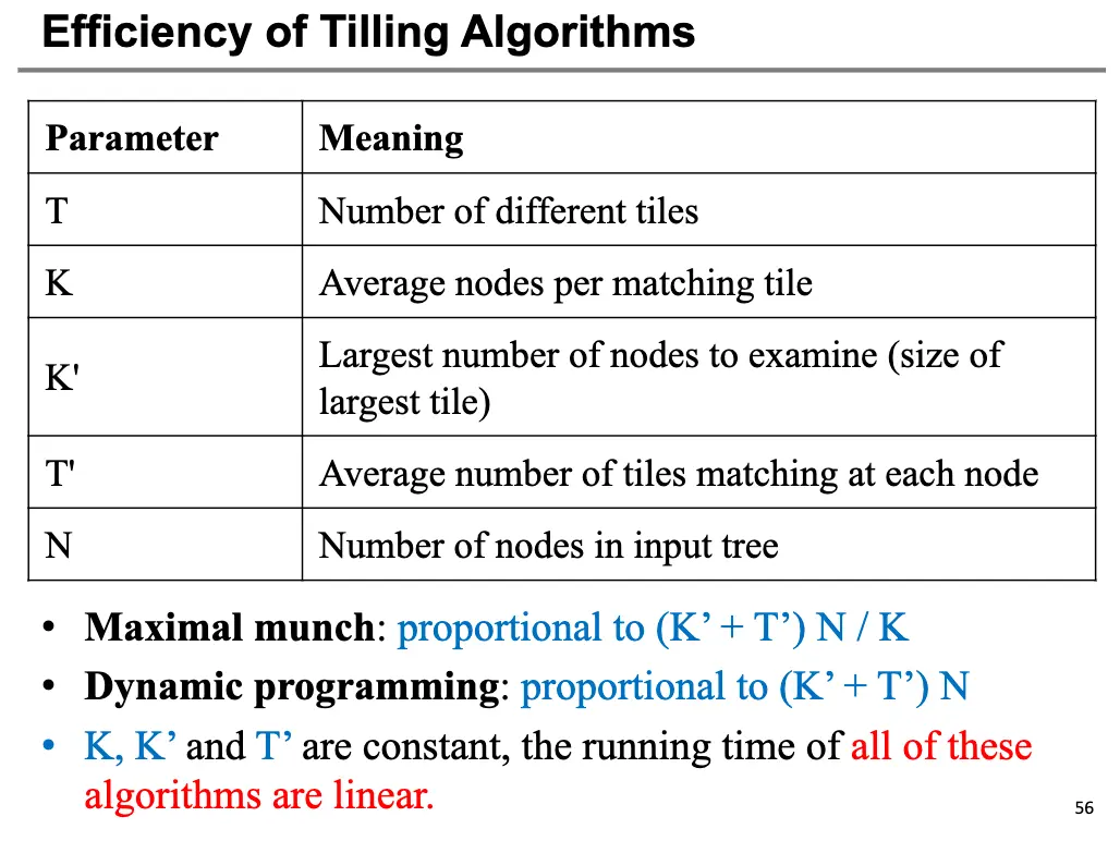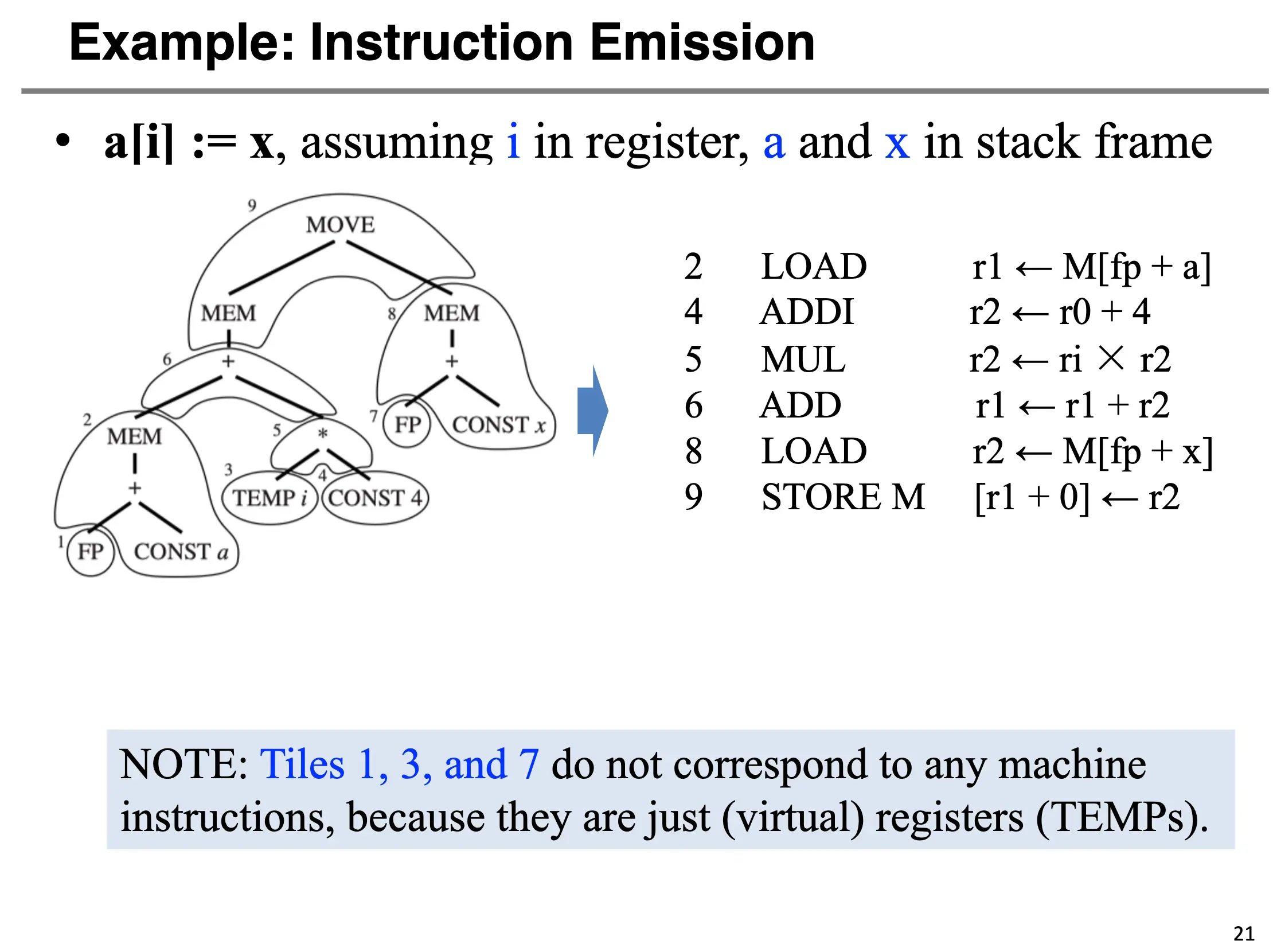 主要思想是从顶部开始,使用最大的 tile 覆盖当前节点,然后递归的对剩下的子树应用该算法,对于两个一样大的 tile,随便选一个或者选择 cost 更小的那个。最后使用 Postorder 的顺序遍历树,子节点的顺序依赖于具体节点的要求。按照顺序发射指令序列,并且使用相同的寄存器链接 tile 边界(当两个 tile 之间需要传递数据的时候)。