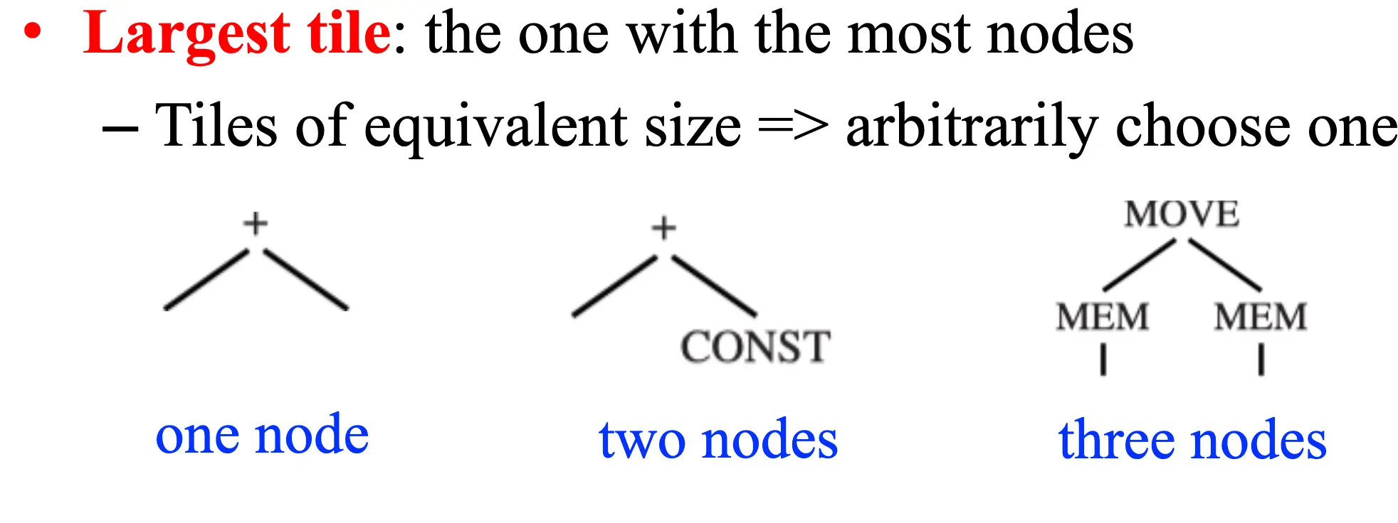 Maximum Munch 采用一个基本假设:更大的 tiles 就是更优的。所谓最大的 tile 就是节点数目最多的 tile,对于两个节点数目相同的 tile,我们随便选择一个当更大的。
