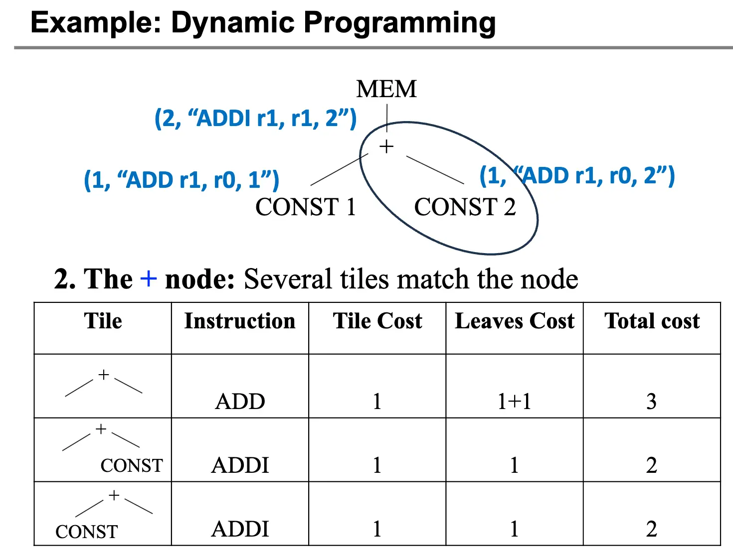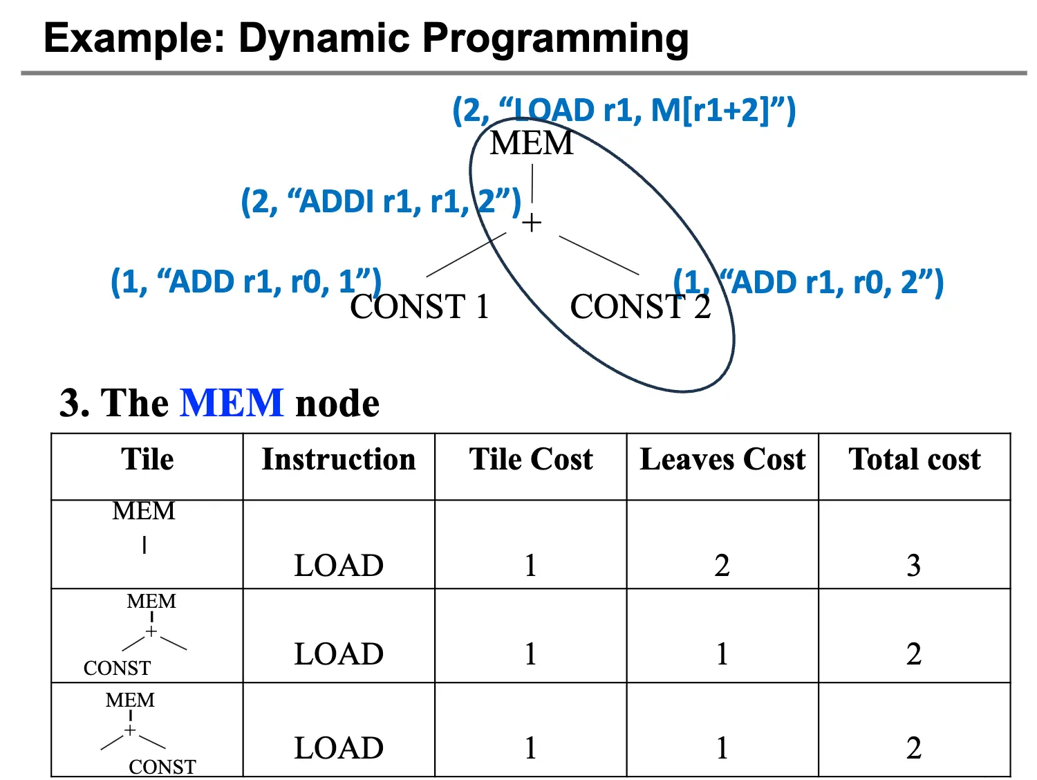 比如对于 MEM(BINOP(PLUS, CONST(1), CONST(2))),计算 CONST(1) 和 CONST(2) 的代价与 tile 都是显然的,使用 ADDI 指令,代价为 1。接下来 + 节点的最优 tile 显然是使用 ADDI 指令,然后 MEM 节点显然是使用带常数的 LOAD 指令: