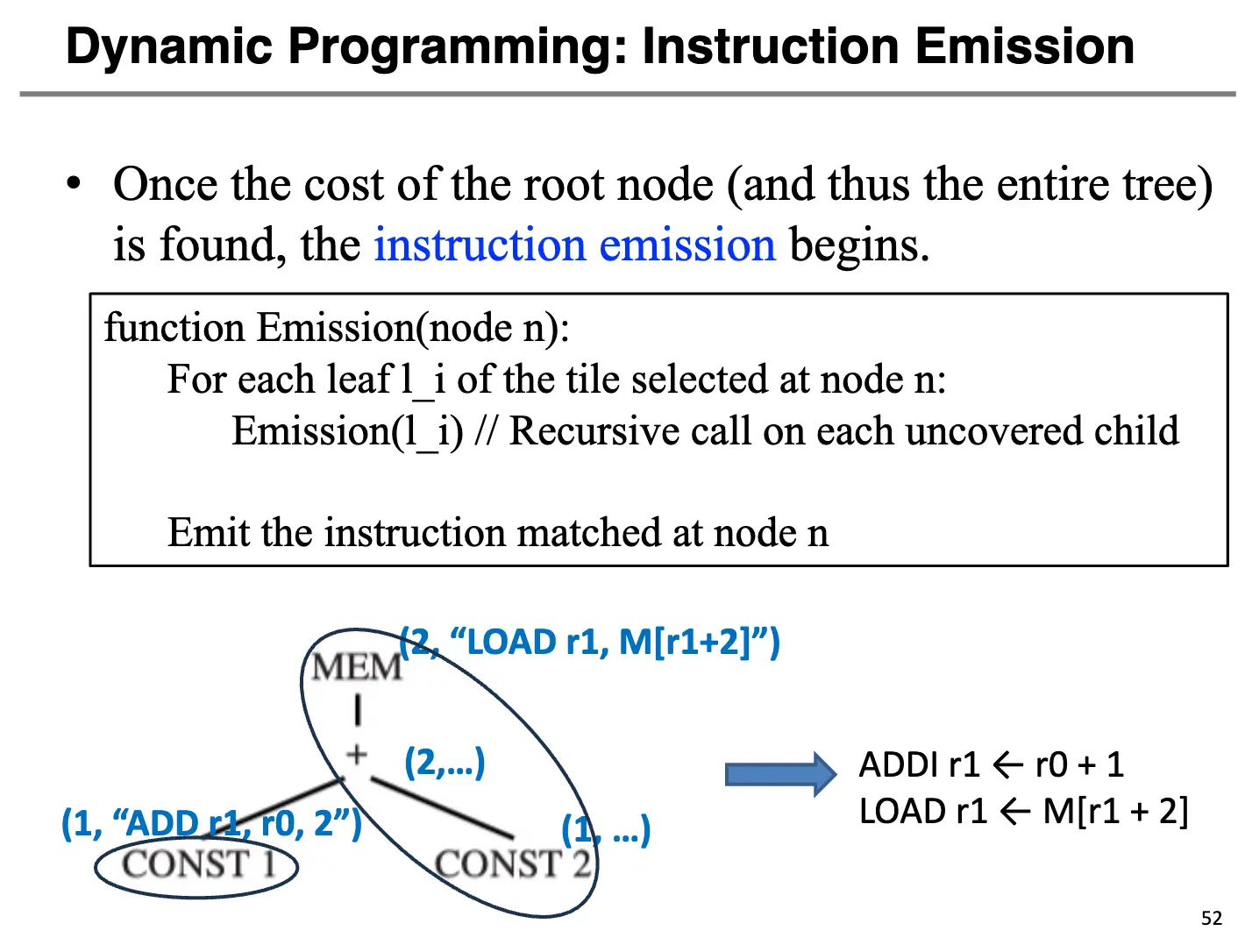一旦根节点的代价被确定之后,整棵树的代价也就确定了,因而指令序列也就确定了,我们开始发射指令。我们将其处理成递归函数,所以实际上是从底开始发射的。因为根节点只有一个子节点 CONST 1,所以发射 CONST 1,然后发射完了再发射根节点的指令。