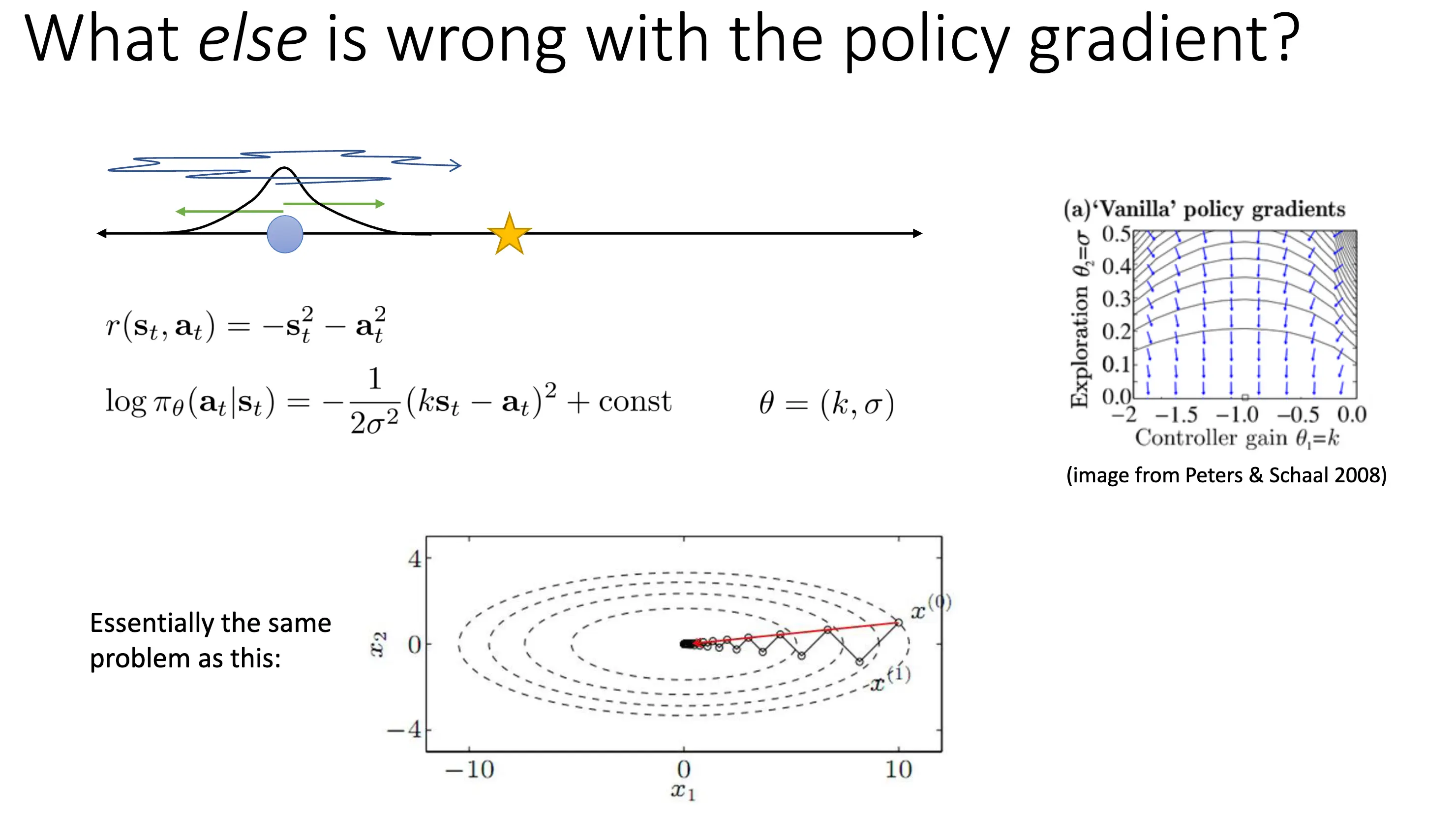 最优解应该在 \(\sigma = 0\),\(k = -1\) 处。从右面梯度图示可以看出,梯度方向事实上没有严格指向最优点,这是因为随着 \(\sigma\) 变小,关于 \(\sigma\) 的梯度量级急剧变大,而关于 \(k\) 的梯度相对来说很小,结果是更新几乎被挤压到减小 \(\sigma\) 上,向最优 \(k\) 的推进变得极慢。这种问题在优化上是 ill-conditioned 的,就好像优化一个特征值极大的二次函数一样困难。接下来介绍可以缓解这个问题的 Covariant/Natural Policy Gradient 方法。