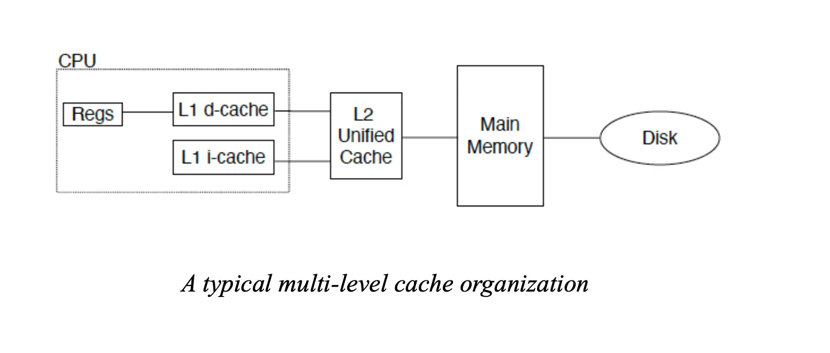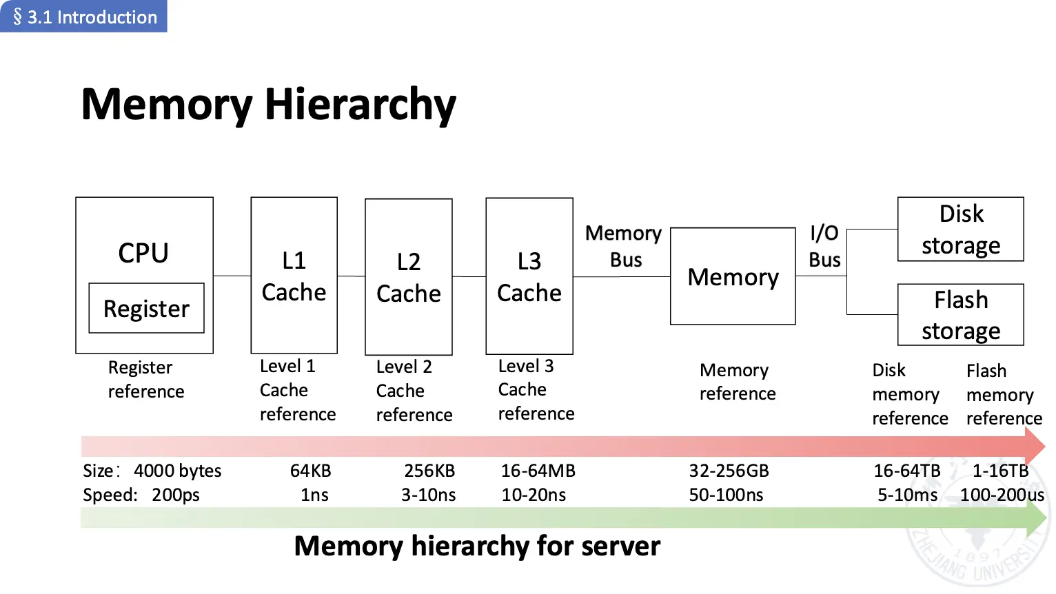 根据用途的差别,我们可以将内存层次结构分为:寄存器/Register、高速缓存/Cache、主存/Main Memory、磁盘/Disk。