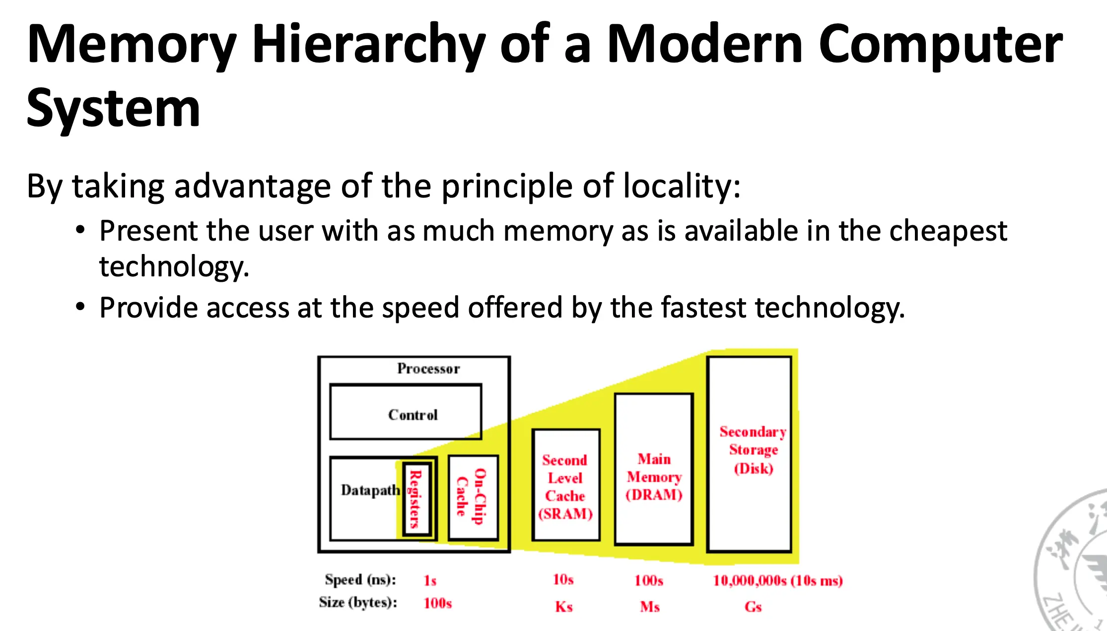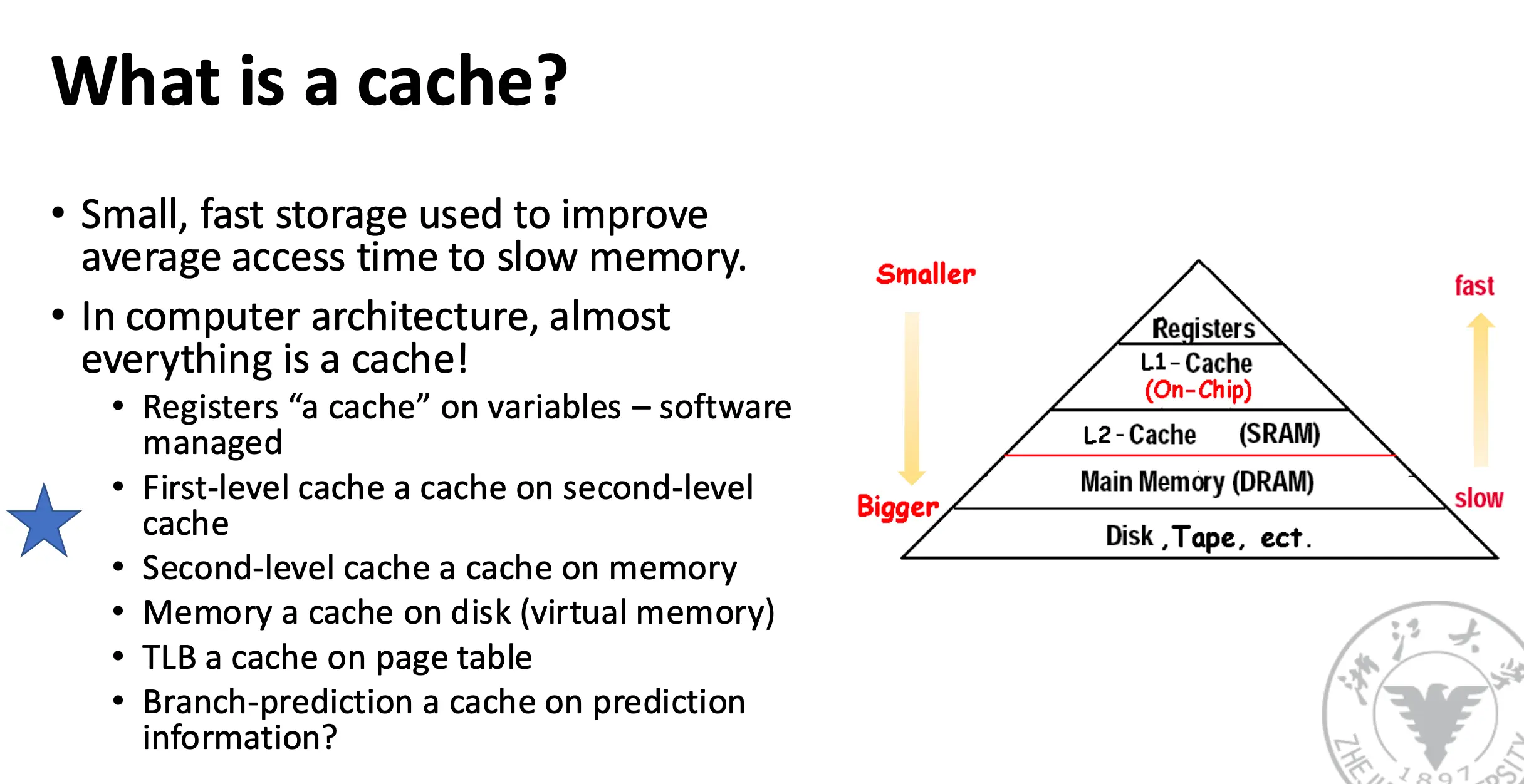 - 地址离开处理器后访问的第一个/最高的内存层次结构;